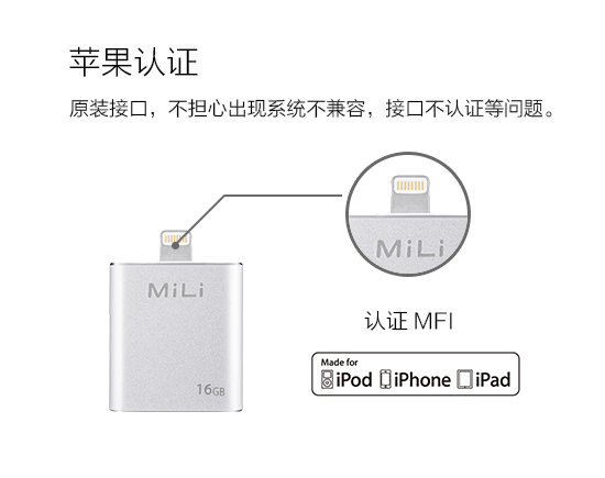 MiLi品牌是國內(nèi)第一批蘋果授權(quán)品牌,在行業(yè)內(nèi)沉淀多年,產(chǎn)品深受消費者喜愛和信賴。MiLi品牌產(chǎn)品中所有的Lightning接頭全部經(jīng)過MFi認(rèn)證,MiLi iData作為蘋果專用U盤,用戶可以放心使用。而接頭未經(jīng)過MFi認(rèn)證的智能U盤易損壞iPhone、iPad.